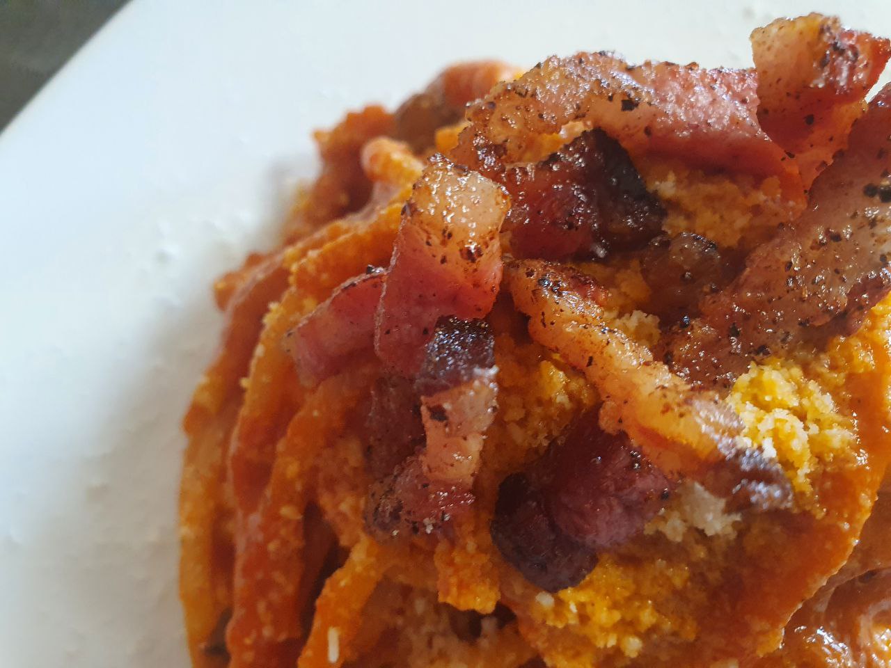 - Impiattate aggiungendo il guanciale messo da parte e una spolverata di pecorino