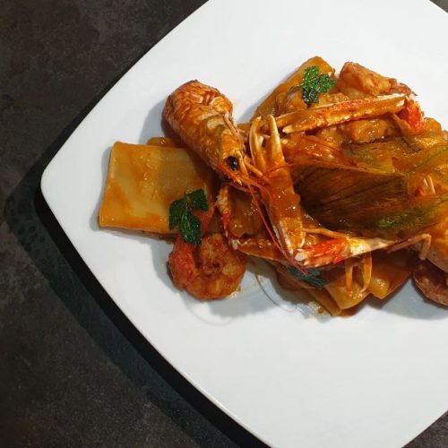 Impiattate e decorate con gli scampi interi e disponete le chips (di fiori di zucca e di prezzemolo) a piacere